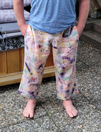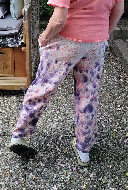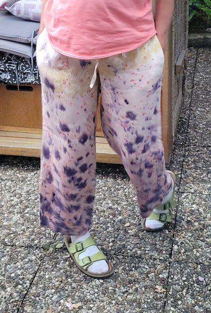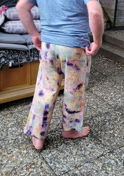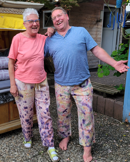 An Leonies Geburtstag lernten wir Christiane und Joe kennen. Christiane erzählte und zeigte mir Bilder von ihrem kreativen Hobby – sie töpfert ganz tolle Figuren, Schüsseln usw. sogar mit verschiedenen Farben. Daraufhin zeigte ich ihr unsere Servietten und sie war vollkommen begeistert. Auch ihrem Mann Joe gefielen die Servietten so gut, dass er mich beauftragte, ihm eine Leinenhose mit auffälliger Pflanzenfärbung herzustellen. Er erzählte, dass er seit Langem auf der Suche nach einer bunten Herrenhose sei, er aber leider keine finde. Für mich war das eine große Ehre und zugleich auch eine große Herausforderung, da ich zuvor noch kein Kleidungsstück mit Kontaktfärbung oder auch Ecoprint angefertigt und verkauft hatte. Christiane schloss sich ihrem Mann an und beauftragte mich ebenfalls mit einer pflanzengefärbten Leinenhose. An dieser Stelle danke ich euch noch einmal für euer Vertrauen. Der Prozess war/ist relativ aufwendig, denn ich hatte noch keine Erfahrung im Bereich Design. So musste ich erstmal überlegen, welche Pflanzenteile ich verwende, also welche Farben auch auf einer größeren Fläche in Kombination gut wirken und schön aussehen. Ich habe einige Muster erstellt, die ich den beiden dann präsentierte. Nach getroffener Musterwahl habe ich alle ausgeschnittenen Stoffteile vorbereitet (entschlichtet und gebeizt - wenn du mehr darüber erfahren möchtest, klicke unten auf den Knopf „Das Färben mit Pflanzen“). Nun habe ich jedes einzelne Stoffteil der Hose entsprechend bearbeitet. Das bedeutet, die verschiedenen Pflanzenteile draufgelegt, draufgesprüht oder geträufelt. Die Stoffteile habe ich dann auf einem Wickelkern (PVC-Rohr) aufgewickelt und in einen Einkochtopf gestellt, der durch Erhitzen von Wasser Wasserdampf erzeugt. Durch den Wasserdampf werden die Farbpigmente auf den Stoff „gedruckt“.