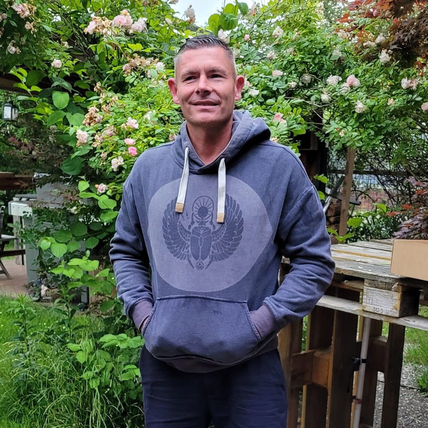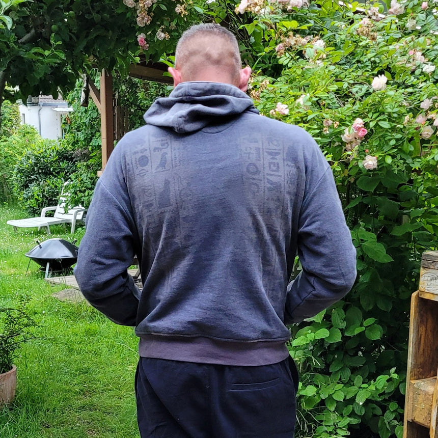Mit Galläpfeln habe ich den Stoff mehrmals gefärbt. So habe ich ein dunkles Beige hinbekommen. Das Rostwasser habe ich angesetzt und in einen Zerstäuber gegossen. Vorher hatte ich mir eine Schablone im Internet rausgesucht, die meinem Gefühl nach perfekt zu Christian und seinen Tattoos passt. Er steht eigentlich eher auf keltische Symbole, aber diese ägyptischen Symbole fand ich sehr ansprechend und dann habe ich nach einer Woche Überlegung bestellt. Mit dem Zerstäuber habe ich das Rostwasser auf den Hoodie gesprüht. Die Reaktion von Gallapfel und Rostwasser ergab dann einen anthrazitfarbenen Ton, ich war so begeistert. Der Aufwand hatte sich sowas von gelohnt.